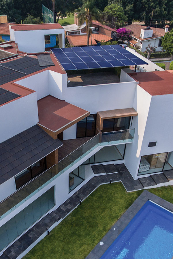 Sombreado parcial de roof garden con paneles traslúcidos. Estructura construida en acero (diseño propio) con ligera inclinación para permitir el escurrimiento pluvial. El diseño de esta instalación fotovoltaica consideró los modernos acabados arquitectónicos de esta residencia, e integró armoniosamente elementos de confort, funcionalidad y estética, a la vez de un sustancial ahorro en la facturación de energía eléctrica.